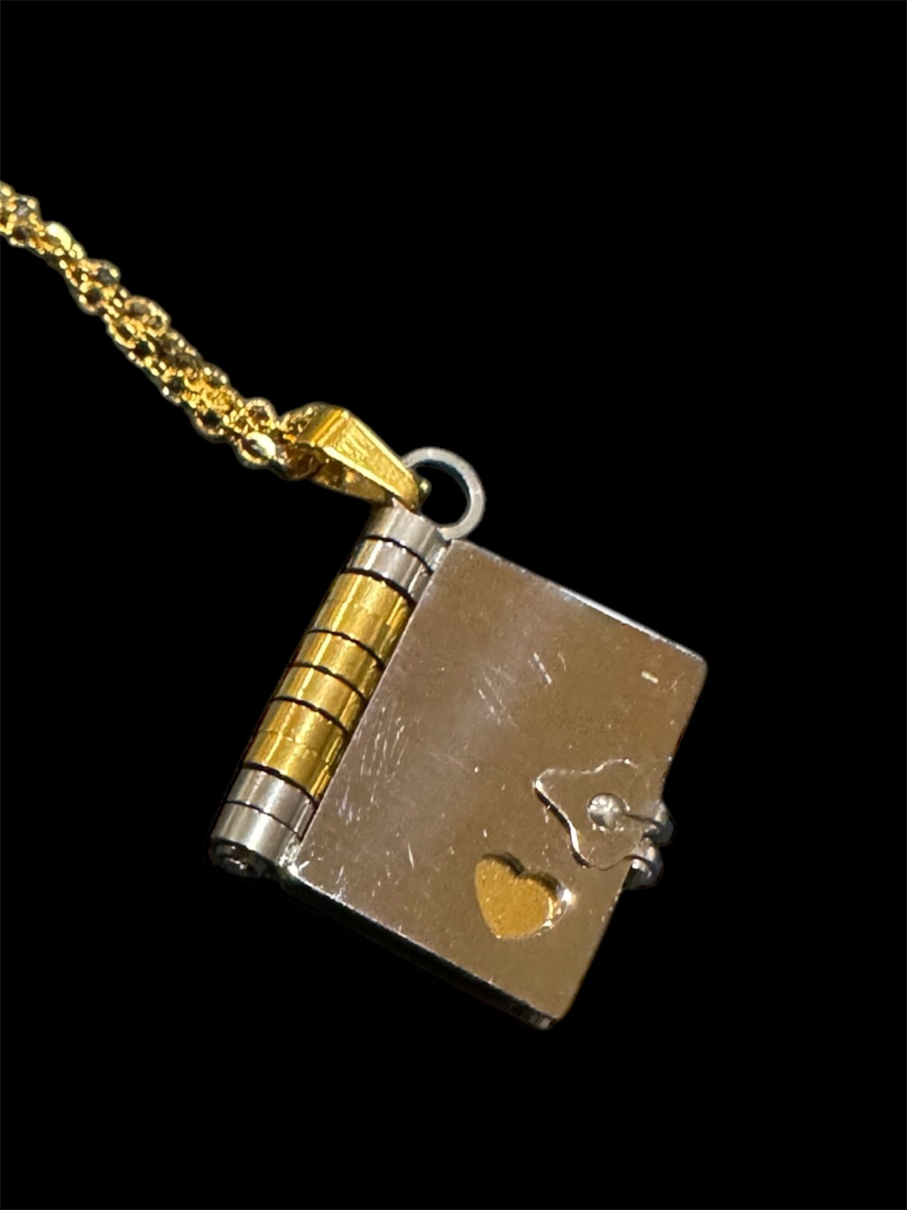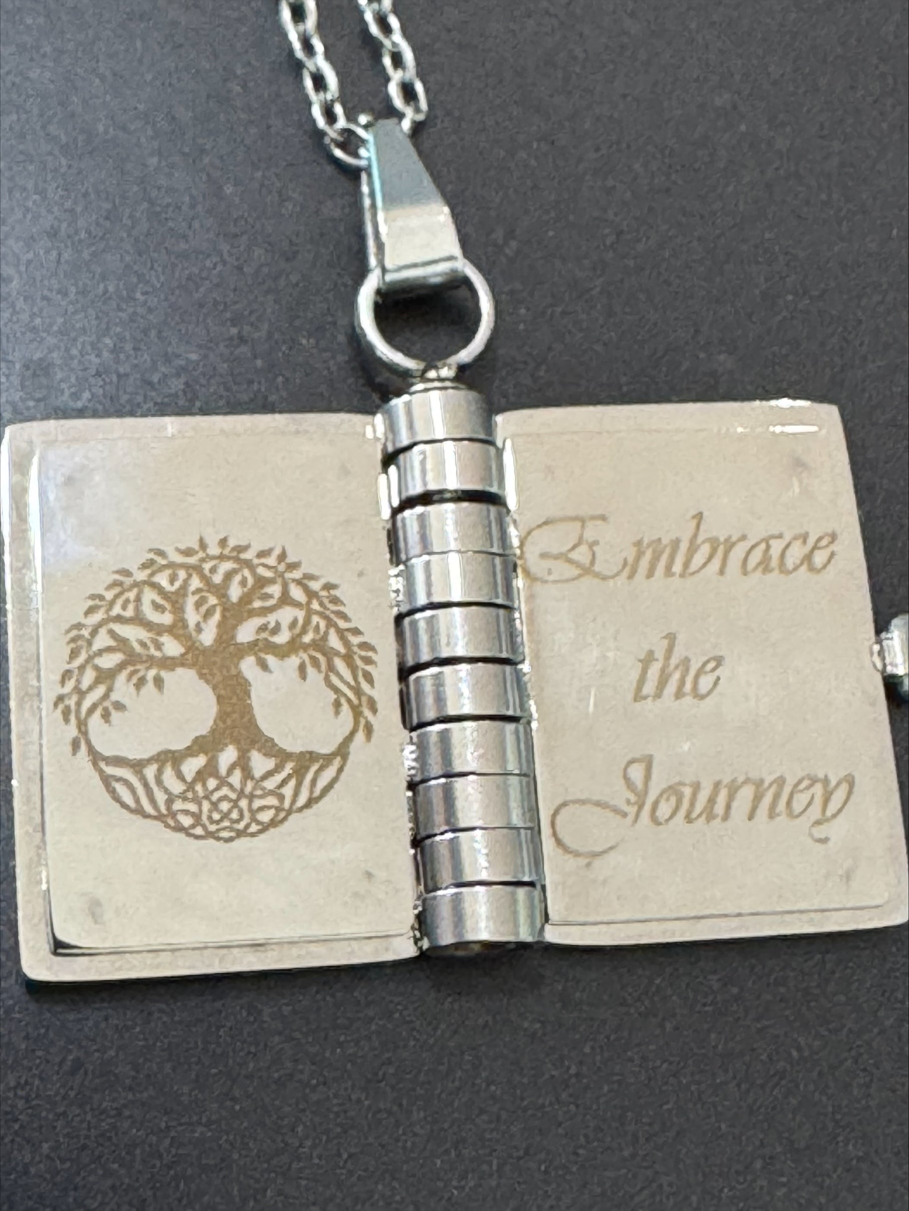 Stainless Steel Book Locket features three engravable pages that can be engraved on the front and back of the pages. This fun locket is perfect for the book lovers in your life, or someone you would like to share a few messages with. The book closes with a small latch that clasps in the front of the book. 18 inch necklace included.